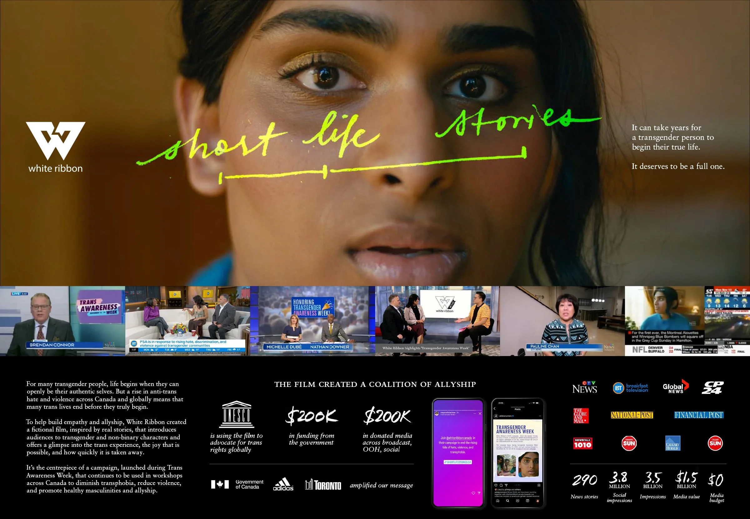 Short Life Stories explores this reality through Vivian, a fictional character inspired by real victims of transphobic violence. The film juxtaposes the joy of transition with the threat of hate, tragically ending in her murder. It featured real trans actors and was produced by a team largely led by members of the 2SLGBTQI+ community